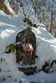 雪の原始林?を歩く気分は爽快です、うっそうと茂る木々の中に続くアップダウンに富んだ細い雪道、観音像が色とりどりのエプロンを巻き雪景色に冴えた姿で道案内してくれます。